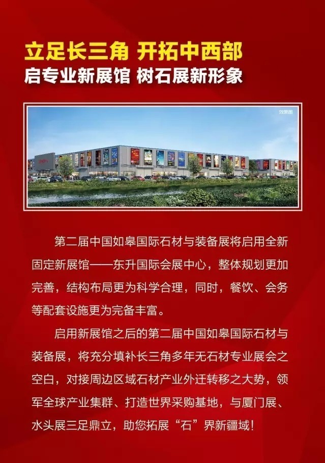 洪鴻志表示,今年第二屆如皋國際石材與裝備展將啟用全新固定的新展館——東升國際會展中心,新展館在整體規劃方面更加完善,結構布局也更為科學合理,同時,餐飲、會務等配套設施更為完備豐富。啟用新展館之后的如皋國際石材與裝備展,將充分填補長三角多年無石材專業展會的空白,對接周邊區域石材產業外遷轉移之大勢,領軍全球產業集群、打造世界級石材采購基地,將與廈門展、水頭展三足鼎立。